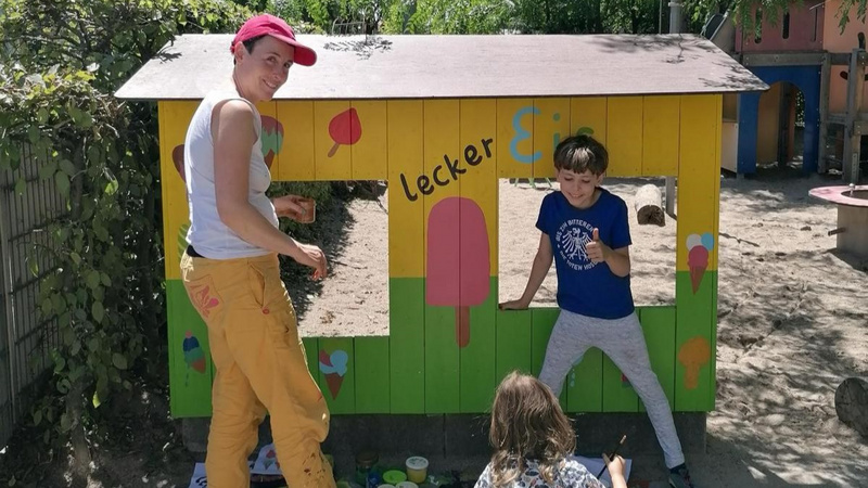 Eltern engagieren sich aktiv: die bunte Eisdiele wird bemalt.