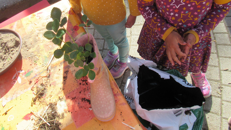 Erdbeeren pflanzen in ausgedienten Gummistiefeln.