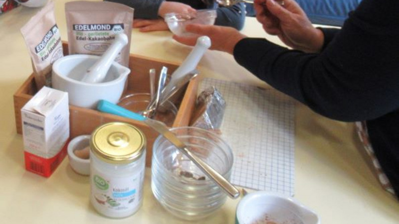 Den Begriff der Gerechtigkeit bei der Verteilung unterschiedlich großen Stücken Schokolade erfahren, eine Kakaobohne sehen/fühlen/riechen und zu Schokocreme verarbeiten, Schokodomino (der Weg von der Kakaobohne zur Schokolade), Wildbienenhaus und die Insekten auf der Blumenwiese beobachten.