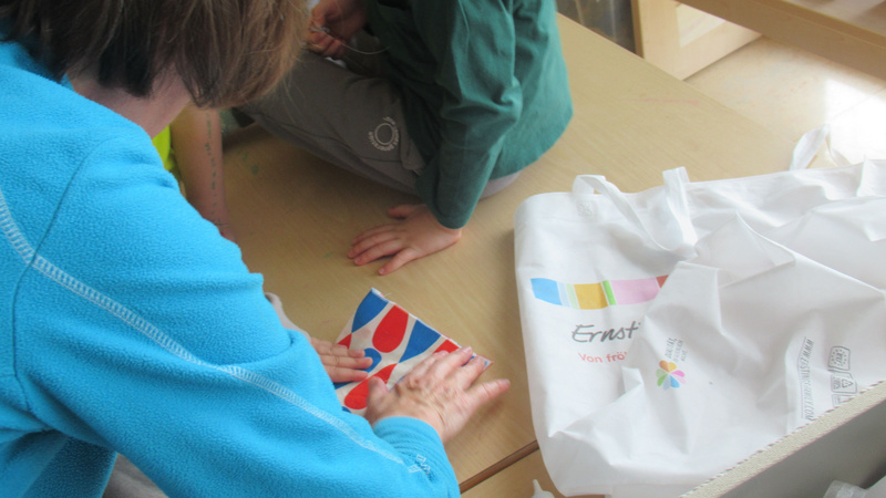 Beteiligung der Eltern: Kleidungsstücke mitgebracht, der Elternbeirat hat den Kleidertauschmarkt organisiert, die Nähmaschine wurde von einer Familie gestellt und ein Vater hat uns die Handhabung gezeigt. Weitere beteiligte: Inhaberin eines Stoffladens informiert und Stoffreste erhalten, Nachbareinrichtung miteinbezogen (deren stationäre Tauschbörse mit den Kindern besichtigt). Aushang einer Fotodokumentation für Interessierte zugänglich.