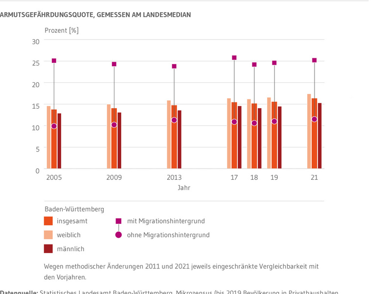 Im Jahr 2021 waren 16,4 Prozent der Bevölkerung in Baden-Württemberg von Armut bedroht. Das entspricht in etwa dem bundesweiten Niveau von 16,6 Prozent. Der Anteil armutsgefährdeter Personen steigt bundesweit und in Baden-Württemberg an. Nicht alle Teile der Bevölkerung sind jedoch gleichermaßen von Armut bedroht. So liegt das Armutsrisiko für Frauen (17,4 %) deutlich über dem von Männern (15,3 %).