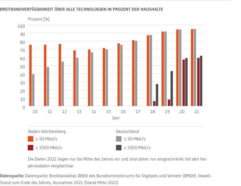 Die Breitbandverfügbarkeit in Baden-Württemberg hat sich in den vergangenen Jahren stark verbessert. Während im gesamten Land Ende 2017 nur 81,3 Prozent der Haushalte mit Bandbreiten von mindestens 50 Mbit/s versorgt waren, lag der Wert Mitte 2021 bereits bei 94,9 Prozent.