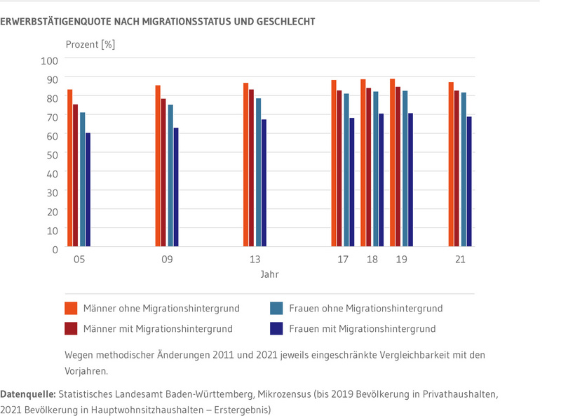 Bei der Bevölkerung mit Migrationshintergrund sind die Geschlechtsunterschiede bei der Erwerbsbeteiligung besonders stark ausgeprägt: Während 82,8 Prozent der männlichen Bevölkerung mit Migrationshintergrund 2021 erwerbstätig waren, lag bei den Frauen derselben Personengruppe die Quote nur bei 69,0 Prozent. Die insgesamt niedrigere Erwerbstätigenquote der Menschen mit Migrationshintergrund ist damit zu einem großen Teil auf die geringe Erwerbsbeteiligung der Frauen zurückzuführen.