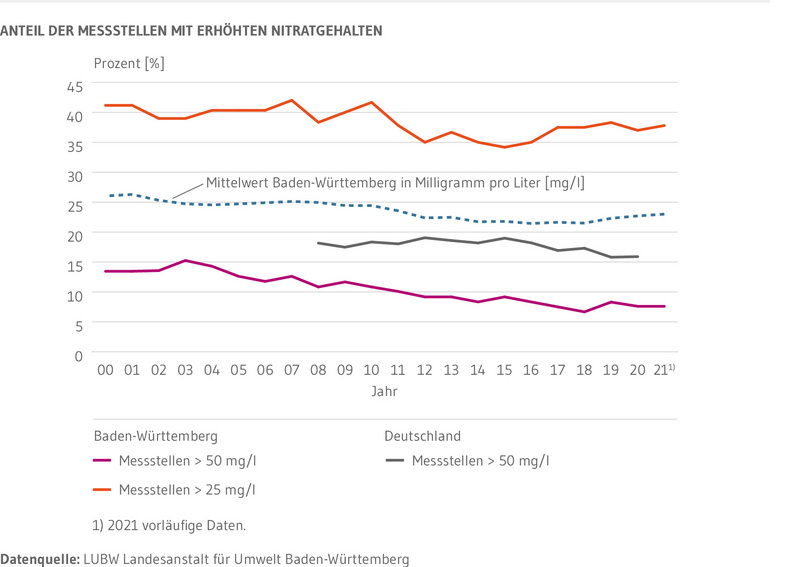 Dargestellt werden der Anteil der Messstellen mit einem Nitratgehalt über 50 Milligramm pro Liter (mg/l) sowie der Anteil der Messstellen mit einem Nitratgehalt über 25 mg/l. Die Messstellen mit Nitratgehalten über 50 mg/l sind eine Teilmenge der Messstellen mit Nitratwerten größer als 25 mg/l. Grundlage für die Berechnung sind 120 seit 1994 durchgehend beprobte Messstellen in ganz Baden-Württemberg. Die Daten dieses Messnetzes werden auch für die jährliche Berichterstattung an die Europäische Umweltagentur (EUA) herangezogen. Im Jahr 2021 konnten nur 119 Messstellen beprobt werden.