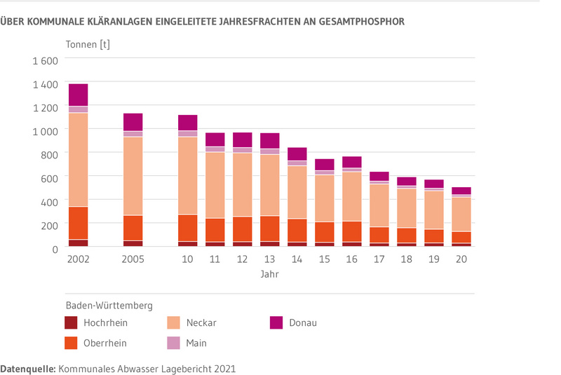 Seit 2010 konnten die Jahresfrachten an Gesamtphosphor mehr als halbiert werden. In den Jahren 2010 bis 2015 wurden besonders in dem insgesamt als defizitär betrachteten Neckargebiet Maßnahmen zur Reduktion der Phosphatfrachten durchgeführt, was zu einem deutlichen Rückgang der Frachten geführt hat. Seit 2015 werden im Rahmen des „Handlungskonzeptes Abwasser“ mittels Überwachungs- und Modellierungskonzepten diejenigen Wasserkörper in Baden-Württemberg identifiziert, in denen Nährstoffdefizite zu einem maßgeblichen Anteil auf Einträge aus Kläranlagen zurückzuführen sind, um dort gezielt Maßnahmen zur Optimierung der Phosphorelimination zu fördern.