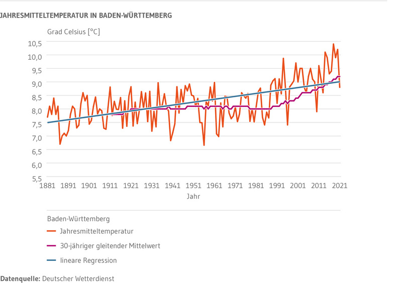 In Baden-Württemberg setzt sich der langjährige Trend der Erwärmung fort. Seit 1881 ist die Jahresmitteltemperatur um 1,5 Grad Celsius angestiegen. Trotz regionaler Unterschiede ist die Erwärmung in allen Regionen Baden-Württembergs festzustellen.