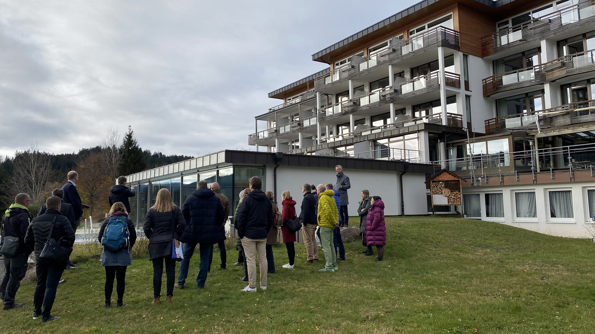 Die Veranstaltung startete im Seehotel Wiesler. Nachdem das Ministerium für Umwelt, Klima und Energiewirtschaft Baden-Württemberg die Teilnehmenden begrüßt hatte, erläuterte Fabian Wiesler vom Seehotel Wiesler den Klimaschutz- und Kreislaufwirtschaftsgedanken des Wellnesshotels am Titisee. Bei einem Betriebsrundgang zeigte er anschließend unter anderem die neue fossilfreie Energieversorgung des Klimabündnis-Unternehmens sowie den kreislauffähigen Neubau der Inara Suites.