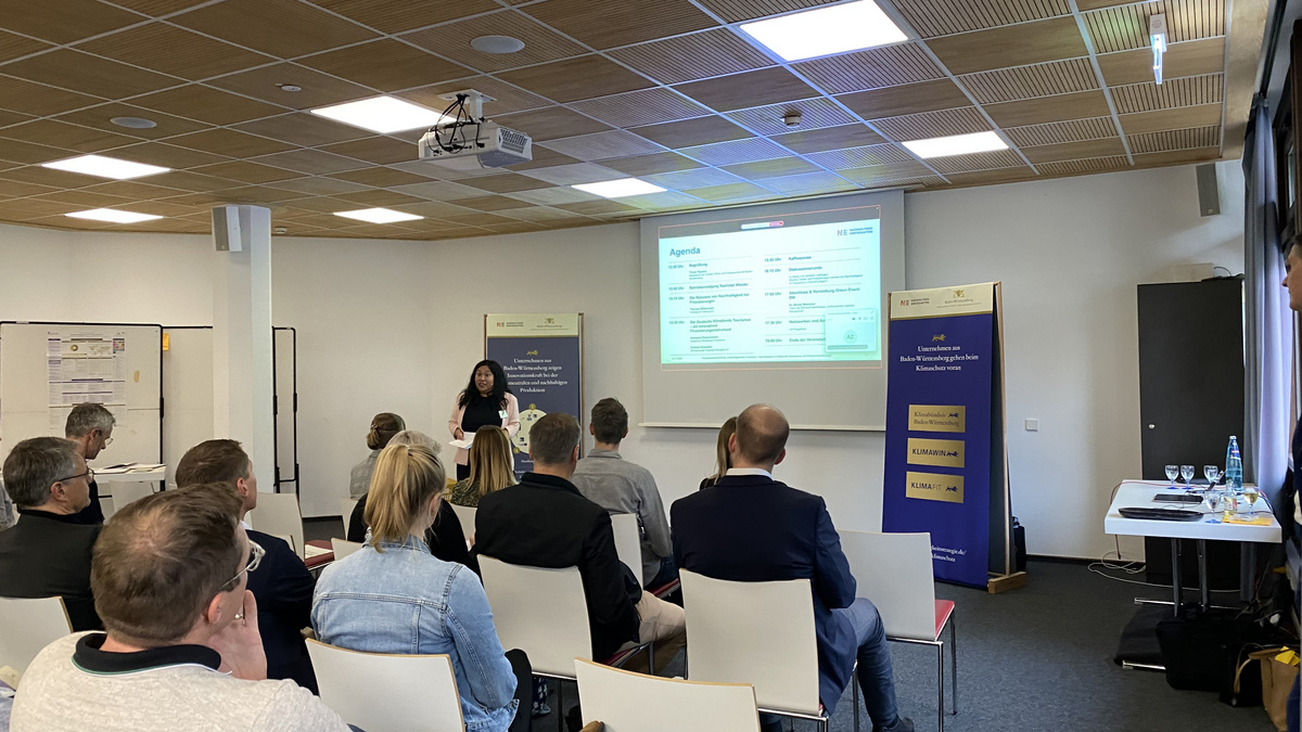 Danach folgte ein interaktiver Workshop im Kurhaus Titisee. Zunächst erläuterte Thomas Mittermaier von der Volksbank Freiburg eG die Relevanz der Nachhaltigkeit bei der Finanzierung von Klimaschutzmaßnahmen. Dann stellte Annegret Zimmermann, Projektleiterin des Deutschen Klimafonds Tourismus, die Initiative und ihre Ziele vor. Isabella Schmider, Geschäftsführerin des Schwarzwald Tourismus Kinzigtal e.V., berichtete aus der Praxis und gab einen Einblick in die Erfassung von Treibhausgasemissionen im Tourismussektor.